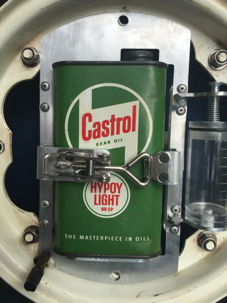 Green Castrol 2 Stroke Oil Can Holder Dispensor For Mounting Inside Lambretta Spare Wheel Rimini Lambretta Centre - Engine Rebuilds, Spraying, Murals And Signwriting Services Also Available.